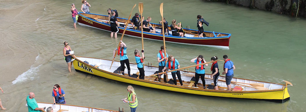 Built in 1838 for the Treffry company of Newquay, by William Peters who on completion believed her to be his finest gig yet. All modern gigs are built to the lines of the Treffry being 32ft in length and 4ft 10in beam. She is light blue in colour with white rubbing strake and underside.