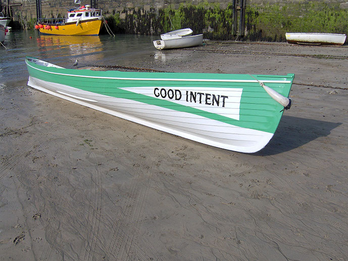 Also built by Tom Chudleigh along with the Active, finished in 1975. Again a copy of the Treffry she was rowed from Newquay to Courtmachsherry in Ireland in July 2003. The Good Intent cellars are just to the south of the Fly cellars behind the harbour's North Quay. She is light green with a white rubbing strake and underside.